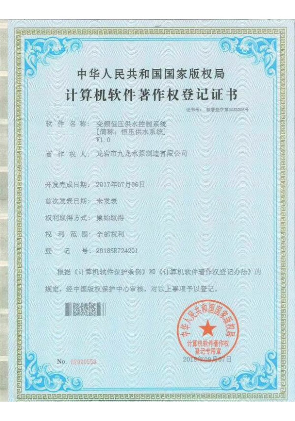 變頻恒壓供水系統(tǒng)軟件著作權證書