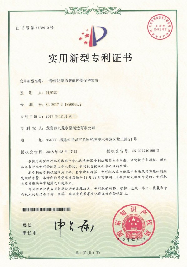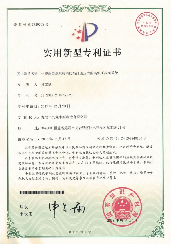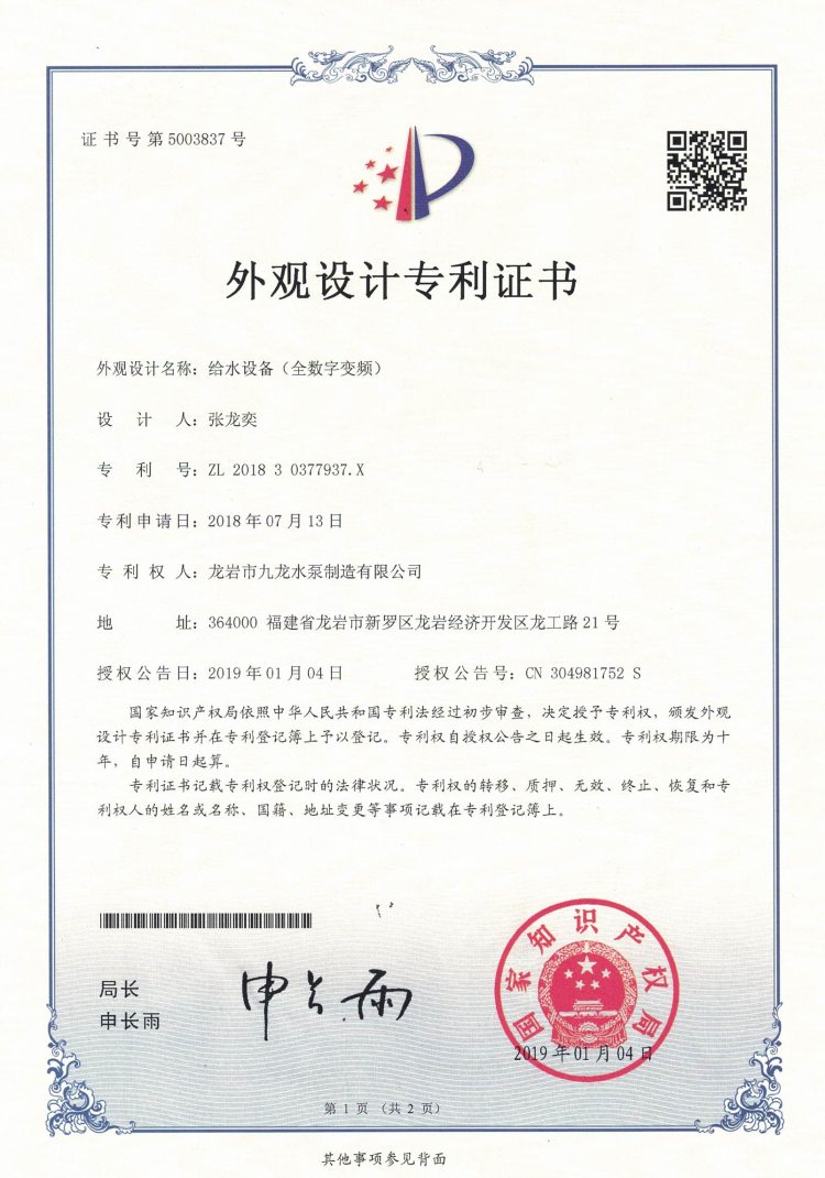 給水設備(全數(shù)字變額)外觀設計專利證書